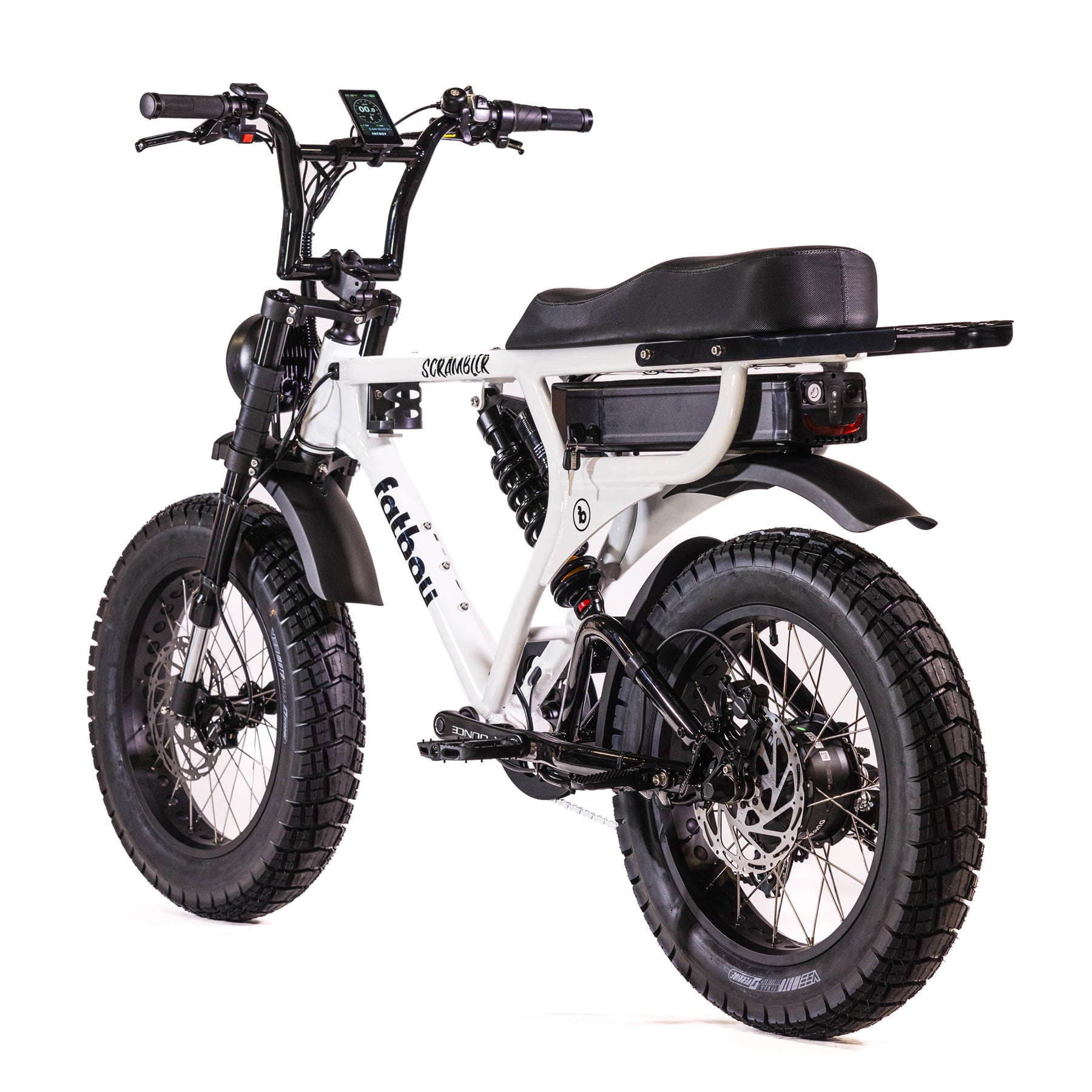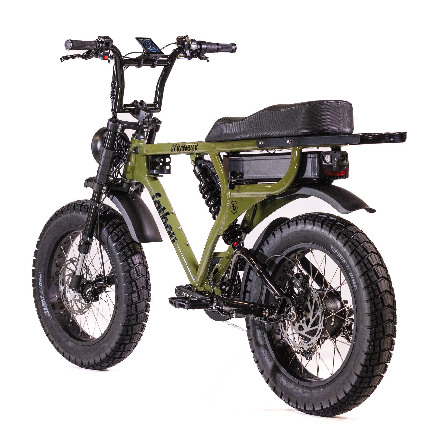 The Fatboy Scrambler V2 comes standard with class leading features including BAFANG HUB Motor with peak power capability of 1560Watts, 1040Wh SAMSUNG Battery, 203mm TEKTRO Hydraulic Disc Brakes, Super bright colour LCD Display, upgraded front suspension with 30mm more travel and rear adjustable motorcycle suspension, 2 seater gripper seat with rear passenger foot pegs, 180kg weight rating and finally our all inclusive 2 year warranty.